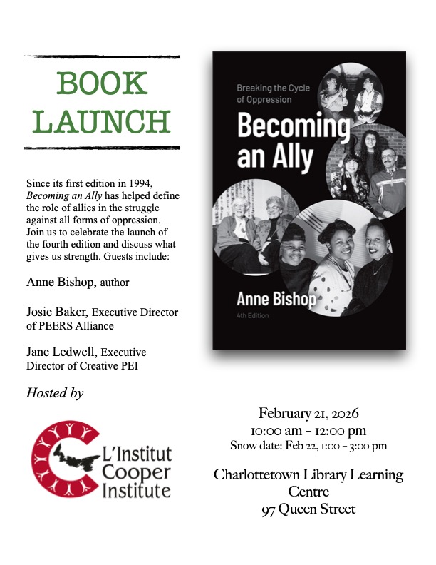 Cooper Institute is proud to be hosting the Charlottetown launch of the fourth edition of Anne Bishop's book, Becoming and Ally: Breaking the Cycle of Oppression on Saturday, February 21 at the Charlottetown Library Learning Centre, 10am-12noon.